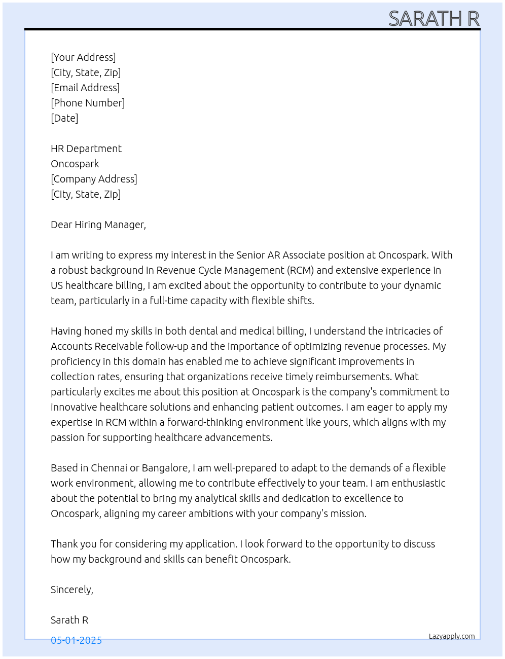 Check out these senior ar associate cover letter sample and examples previously used by job seekers to land on job interviews as senior ar associate. Use our AI cover letter generator to create a personalized cover letter as senior ar associate.