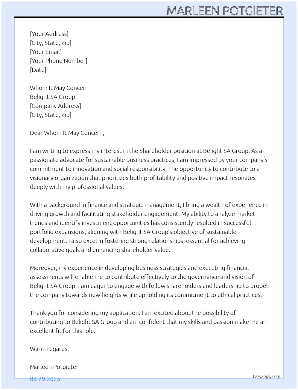 Check out these shareholder cover letter sample and examples previously used by job seekers to land on job interviews as shareholder. Use our AI cover letter generator to create a personalized cover letter as shareholder.