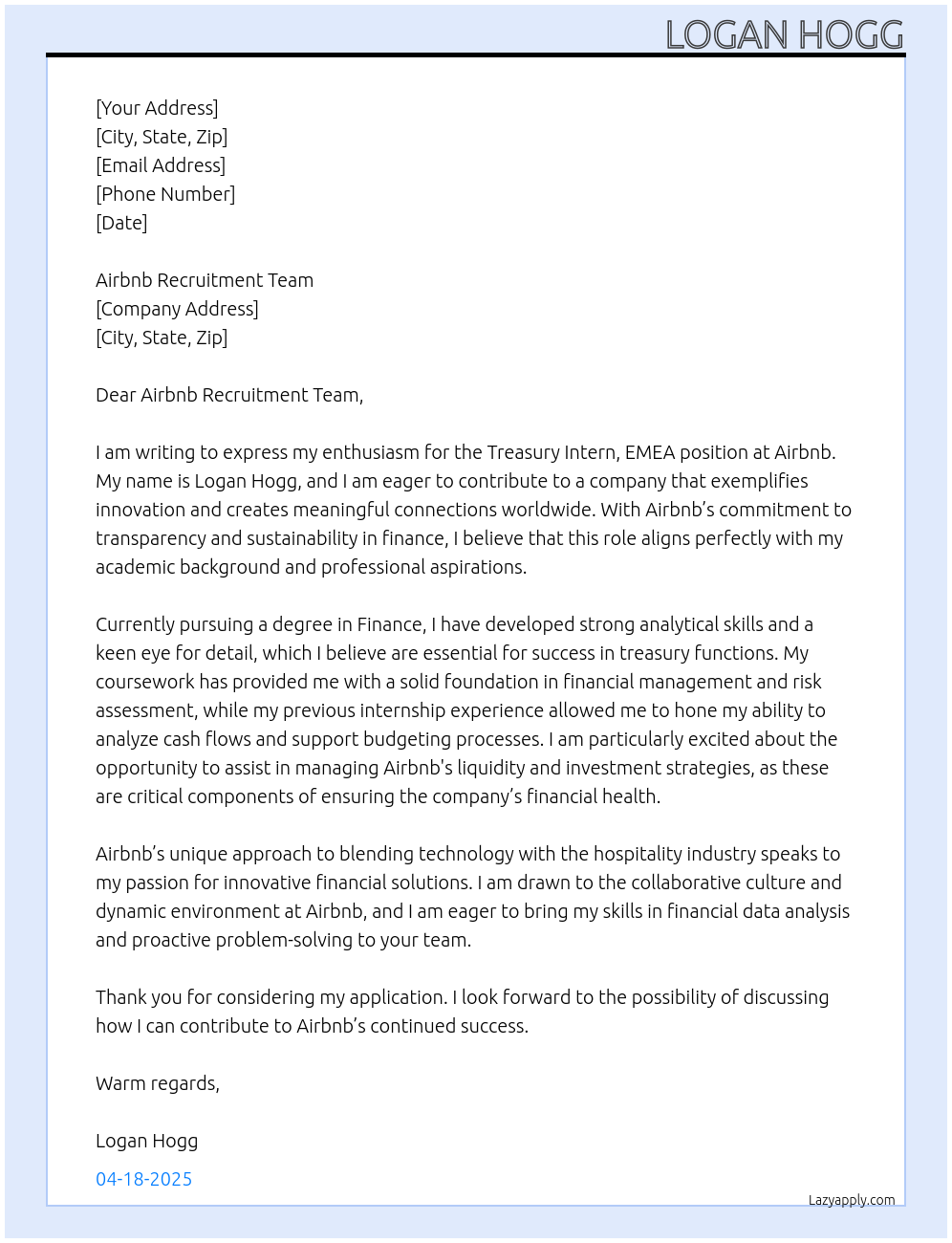 Check out these treasury intern, emea cover letter sample and examples previously used by job seekers to land on job interviews as treasury intern, emea. Use our AI cover letter generator to create a personalized cover letter as treasury intern, emea.