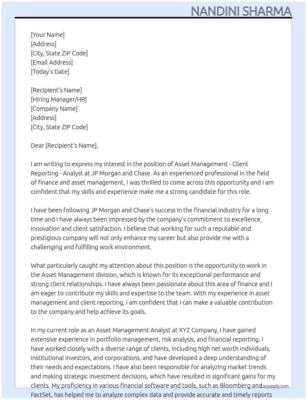 Asset Management - Client Reporting - Analyst Cover Letter At JP Morgan and chase