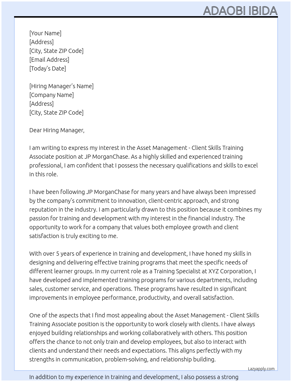 Asset Management - Client Skills Training Associate Cover Letter At JP MorganChase