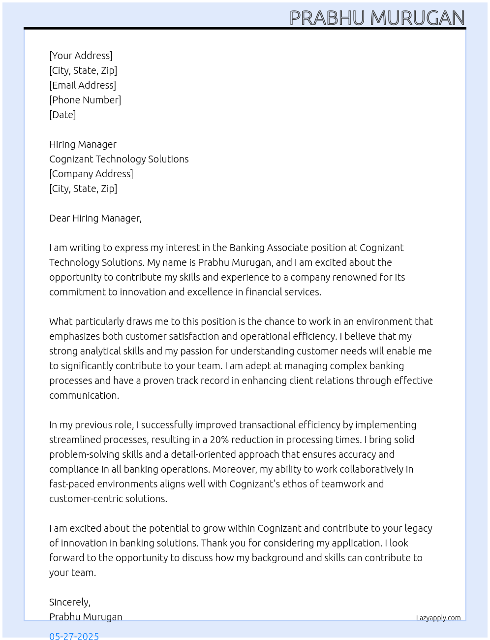 Check out these banking associate cover letter sample and examples previously used by job seekers to land on job interviews as banking associate. Use our AI cover letter generator to create a personalized cover letter as banking associate.