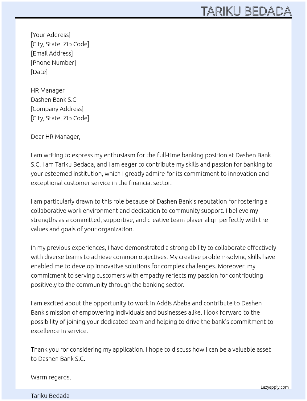 Banking Jobs Cover Letter At Dashen Bank S.C