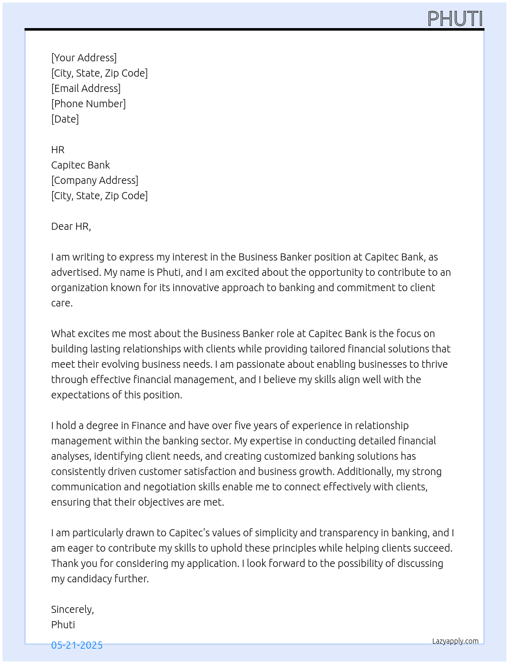 Check out these business banker cover letter sample and examples previously used by job seekers to land on job interviews as business banker. Use our AI cover letter generator to create a personalized cover letter as business banker.