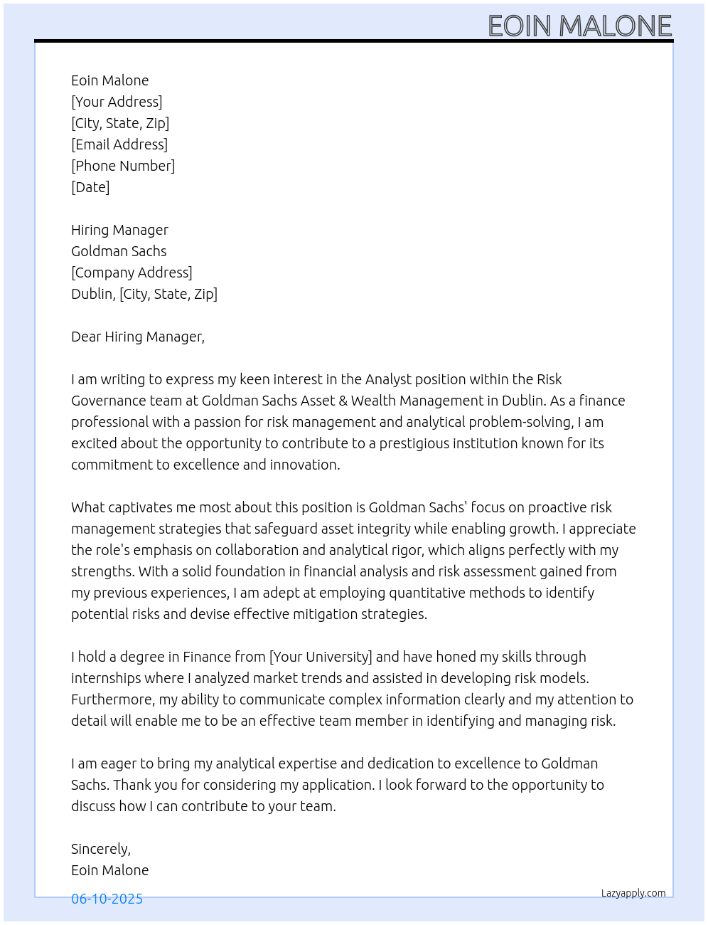 Goldman Sachs Asset & Wealth Management - Risk Governance - Analyst - Dublin Cover Letter Examples And Template