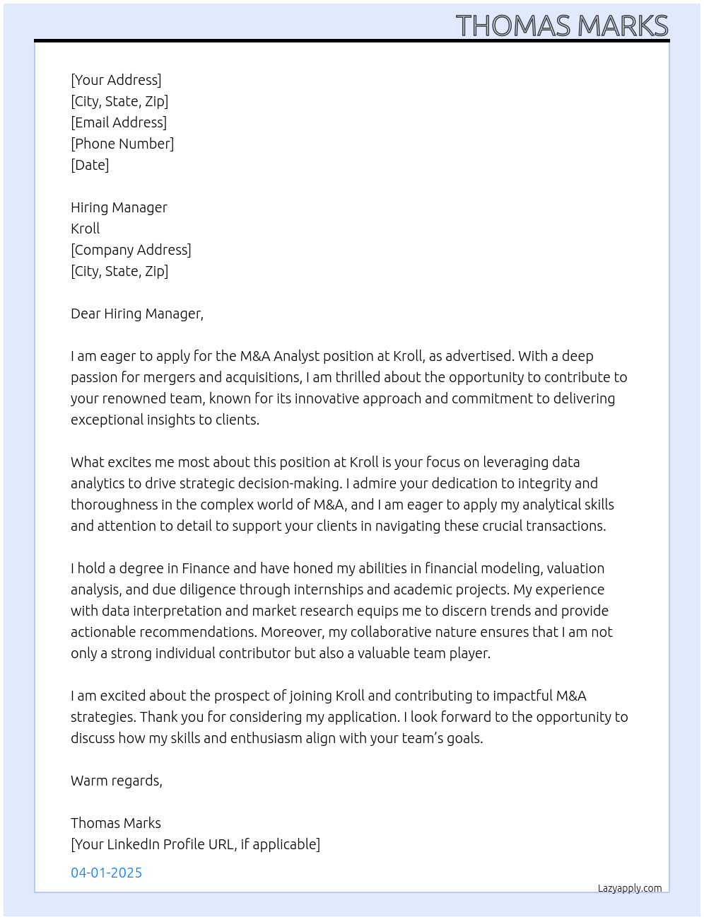 M&a Analyst Cover Letter