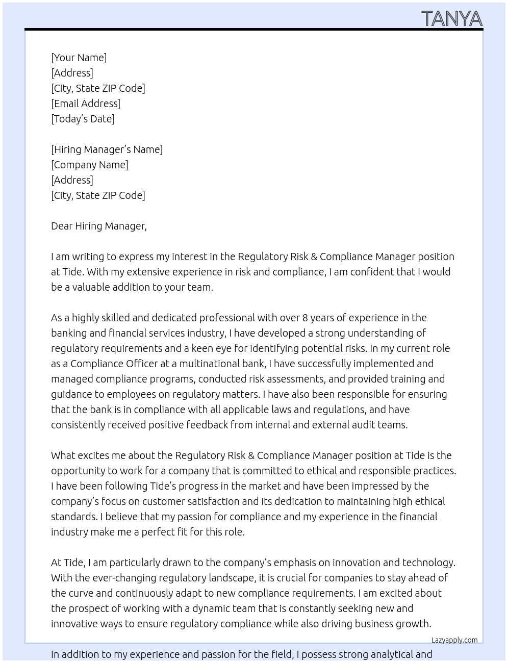 Regulatory Risk & Compliance Manager Cover Letter At Tide