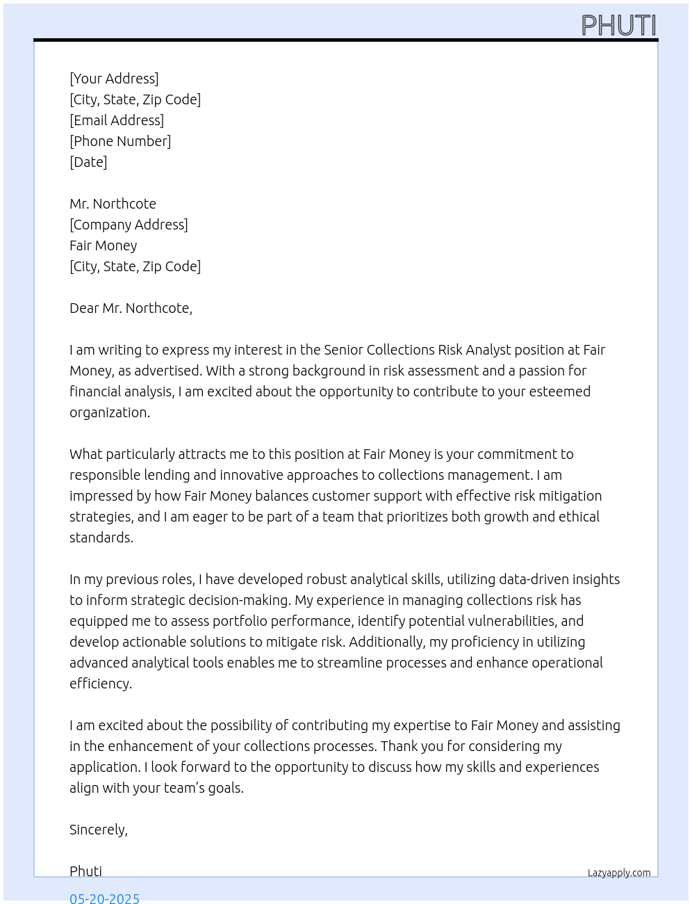 Senior Collections Risk Analyst Cover Letter At Fair Money