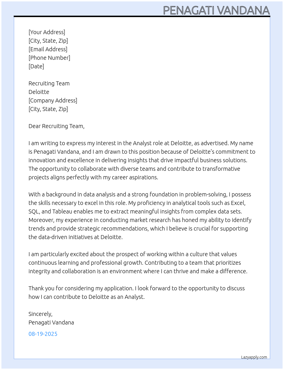 Analyst Role At Deloitte Cover Letter