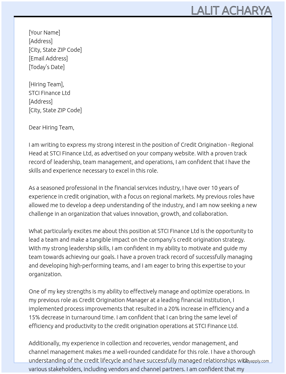 Credit Origination - Regional Head Cover Letter Examples And Template