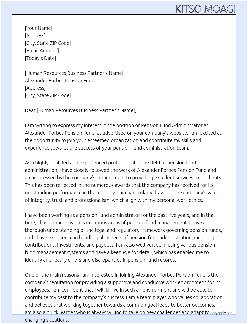 pension fund administrator Cover Letter At Alexander Forbes Pension Fund