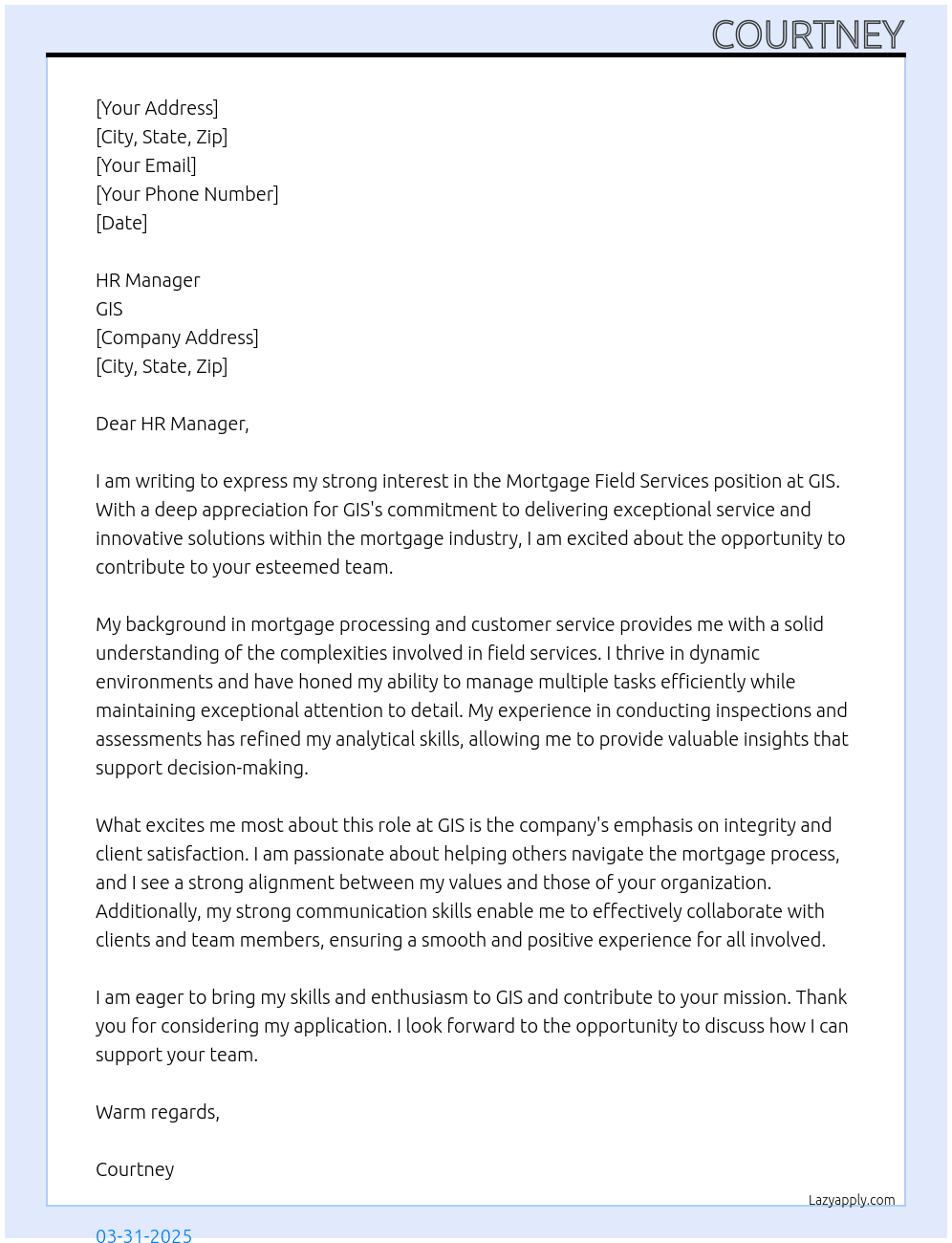 Check out these mortgage field serices cover letter sample and examples previously used by job seekers to land on job interviews as mortgage field serices. Use our AI cover letter generator to create a personalized cover letter as mortgage field serices.
