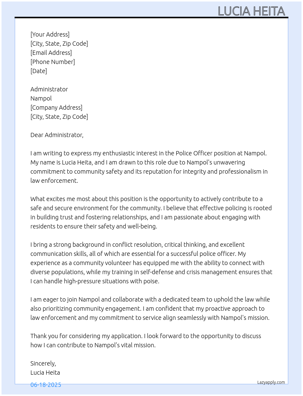 Check out these police offcier cover letter sample and examples previously used by job seekers to land on job interviews as police offcier. Use our AI cover letter generator to create a personalized cover letter as police offcier.