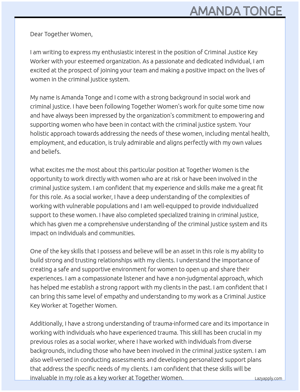 CRIMINAL JUSTICE KEY WORKER Cover Letter At TOGETHER WOMEN