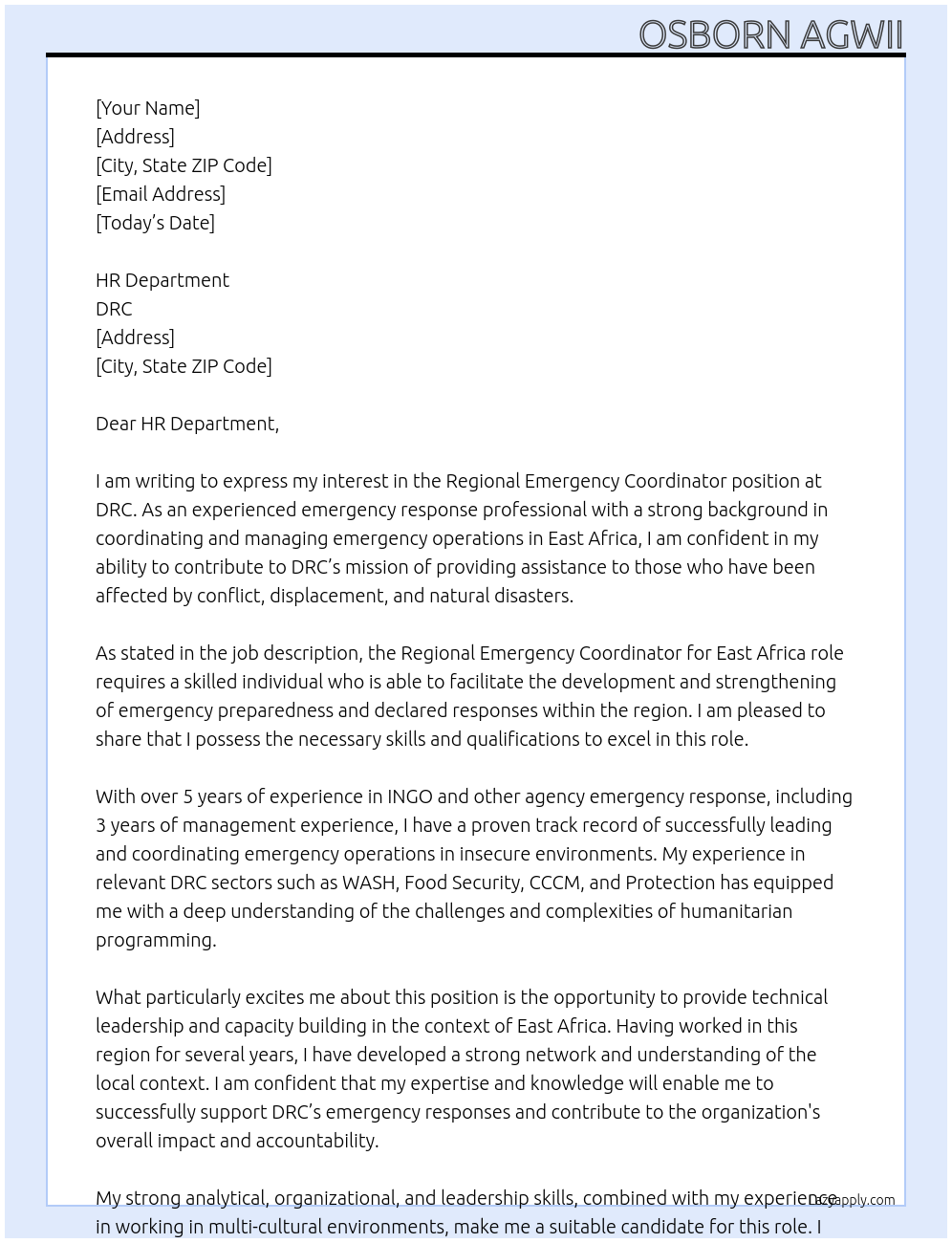 impact and accountability of DRC’s emergency responses. Your main duties and responsibilities will be: Emergency Preparedness and Response • Ensure preparedness by facilitating quality and relevant Emergency Preparedness Plans (EPP) across East Africa; • Lead the Regional Emergency Preparedness Working Group in order to prioritise and plan for timely and quality emergency responses and remain up to date on contextual and operational concerns across the region • Support the delivery of declared emergency responses through the Emergency Task Force and DRC emergency processes Quality Assurance • Ensure countries are using and able to use correct emergency response tools in line with global guidance • Support the development of new tools and processes with HQ emergency team where relevant • Work with RO and CO technical staff to ensure integration of emergency response into Strategic Plans