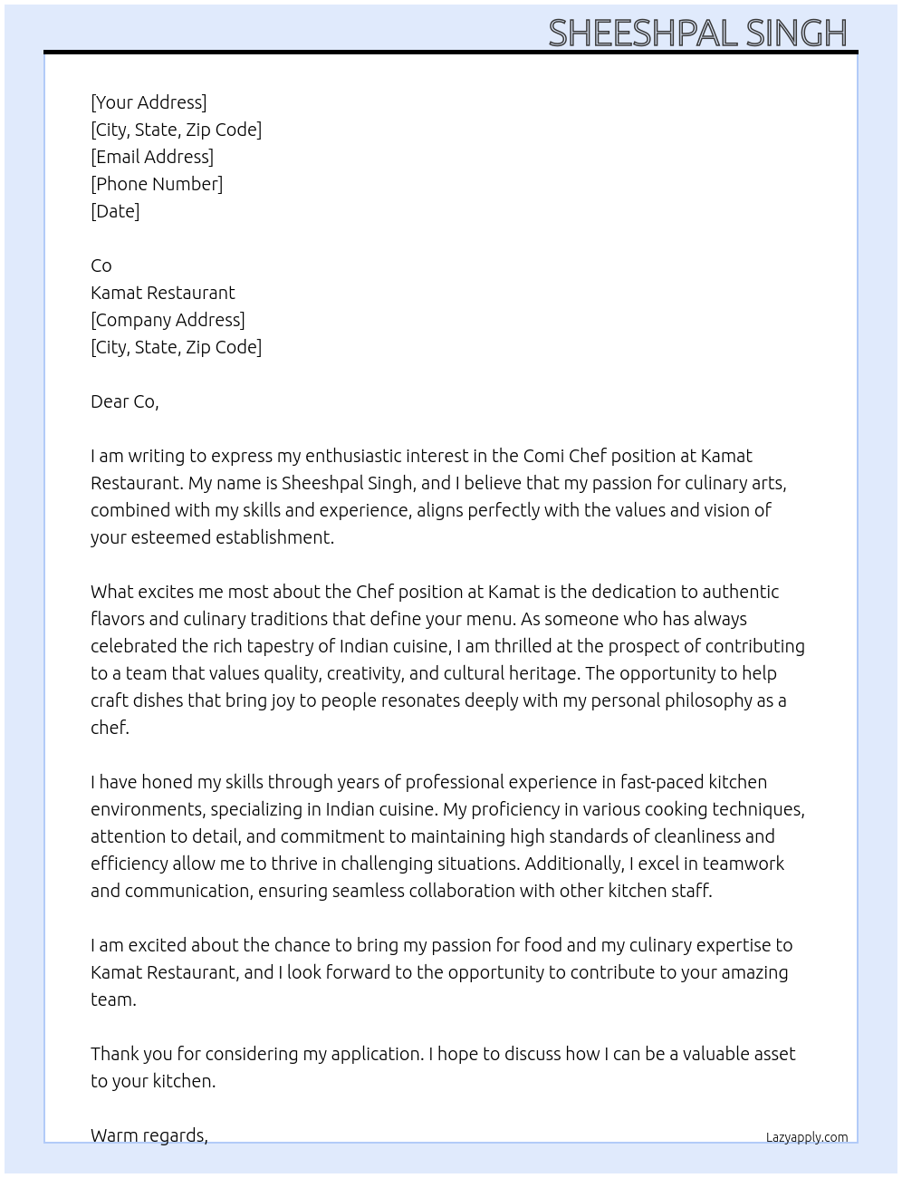 Comi chef Cover Letter At Kamat restaurant