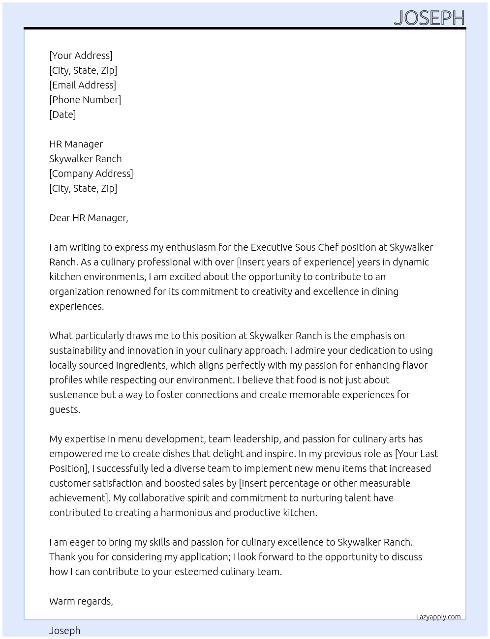 Executive Sous Chef At Skywalker Ranch Cover Letter