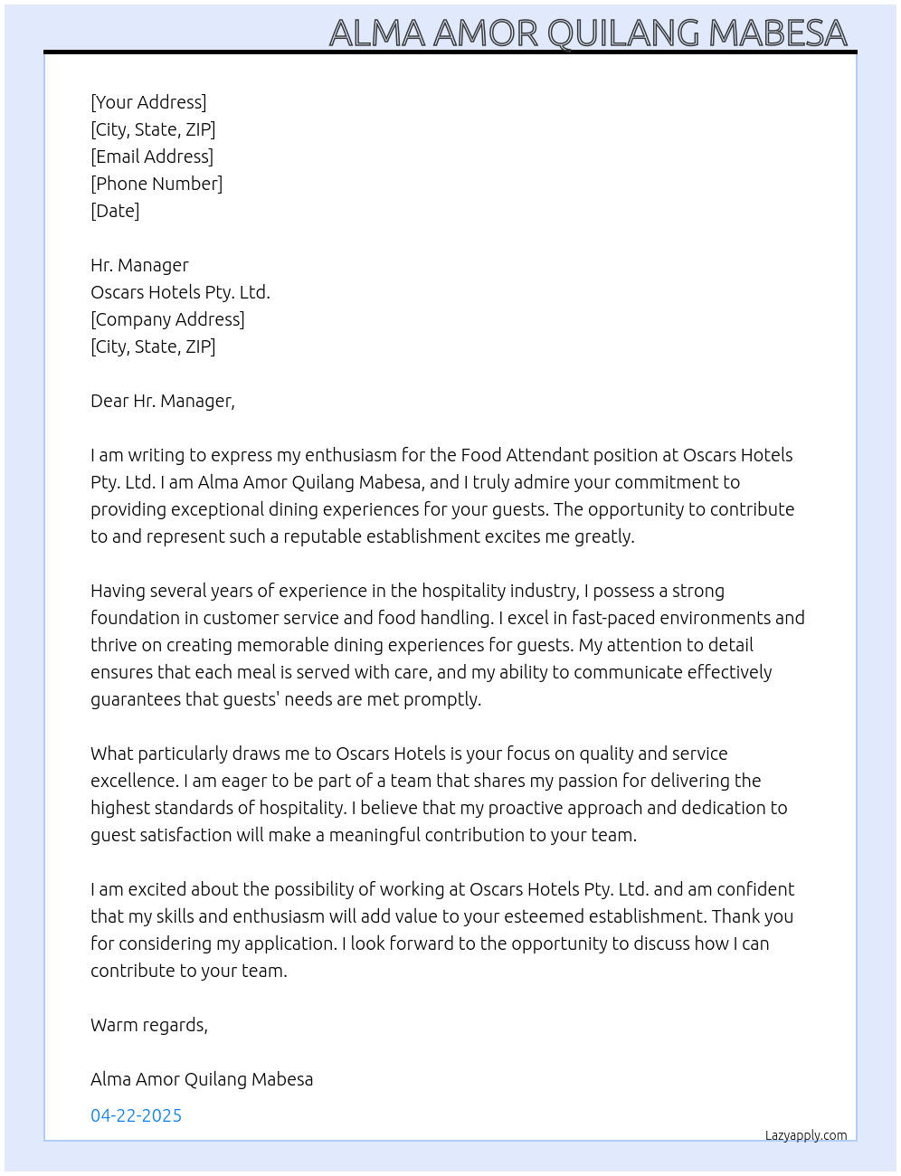 Food Attendant Cover Letter At Oscars Hotels Pty. Ltd.