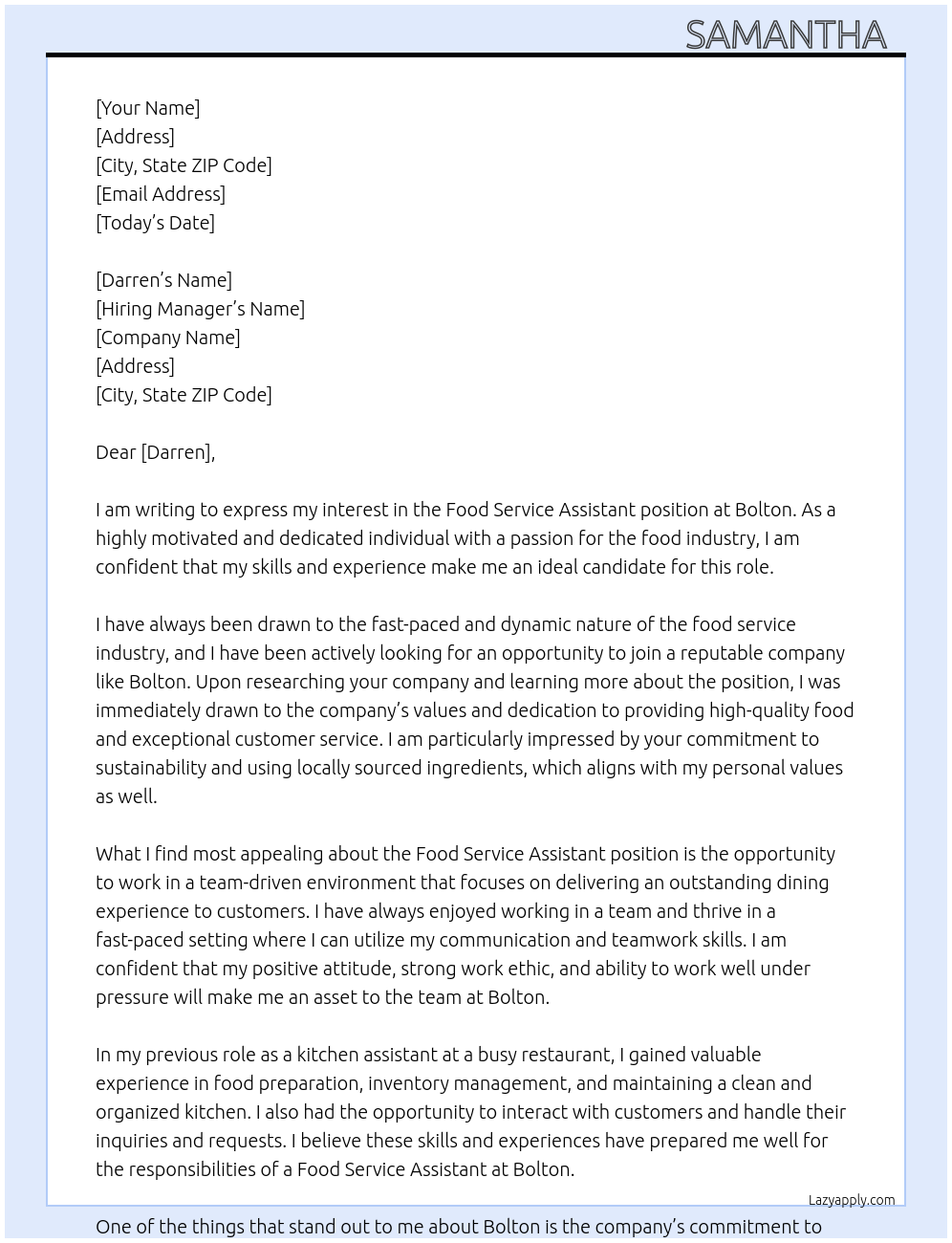 Food service assistant Cover Letter At Bolton