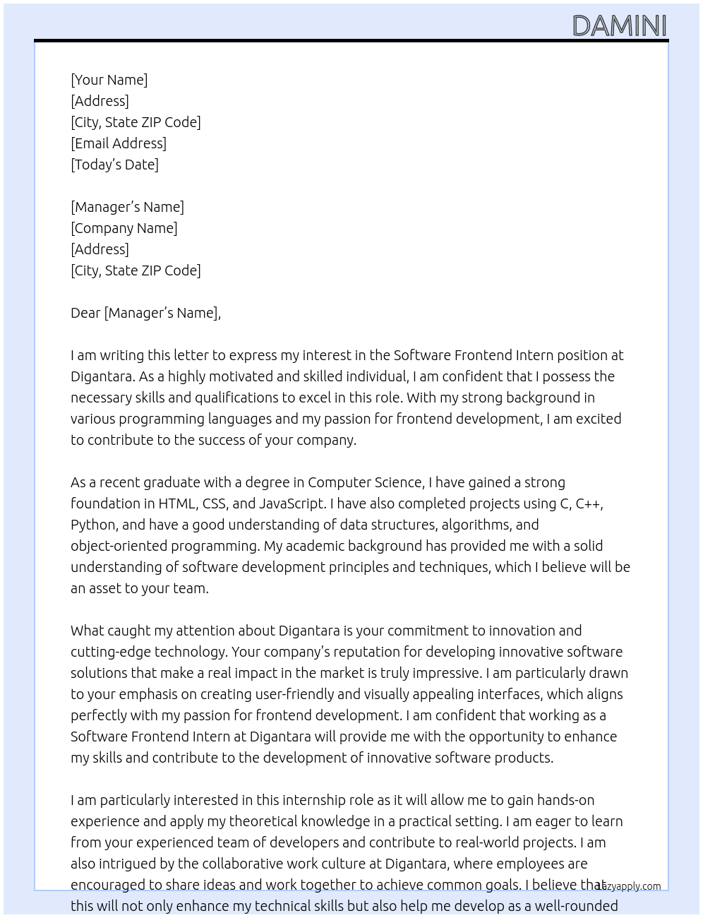 Check out these software frontend intern cover letter sample and examples previously used by job seekers to land on job interviews as software frontend intern. Use our AI cover letter generator to create a personalized cover letter as software frontend intern.