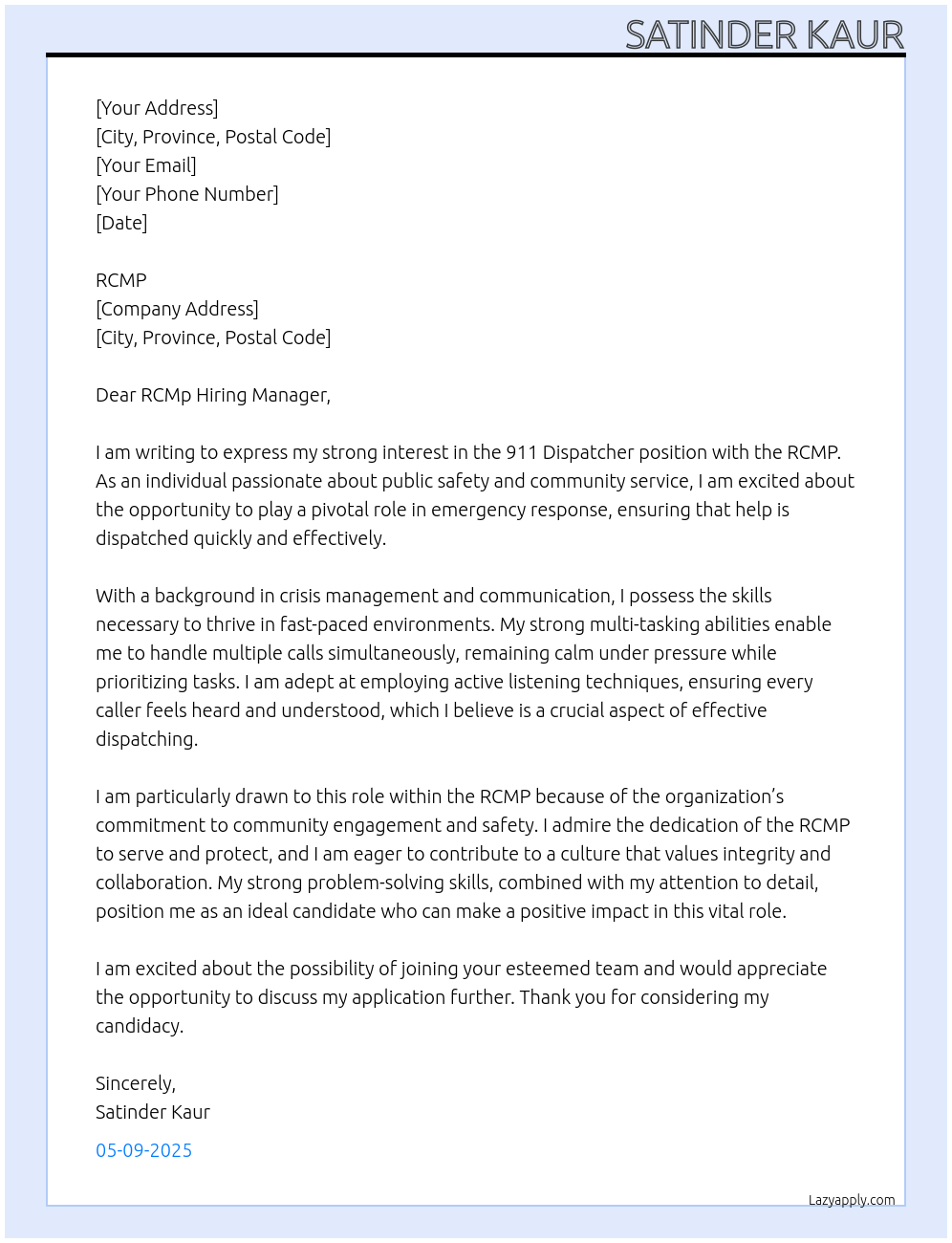 Check out these 911 dispachter rcmp cover letter sample and examples previously used by job seekers to land on job interviews as 911 dispachter rcmp. Use our AI cover letter generator to create a personalized cover letter as 911 dispachter rcmp.