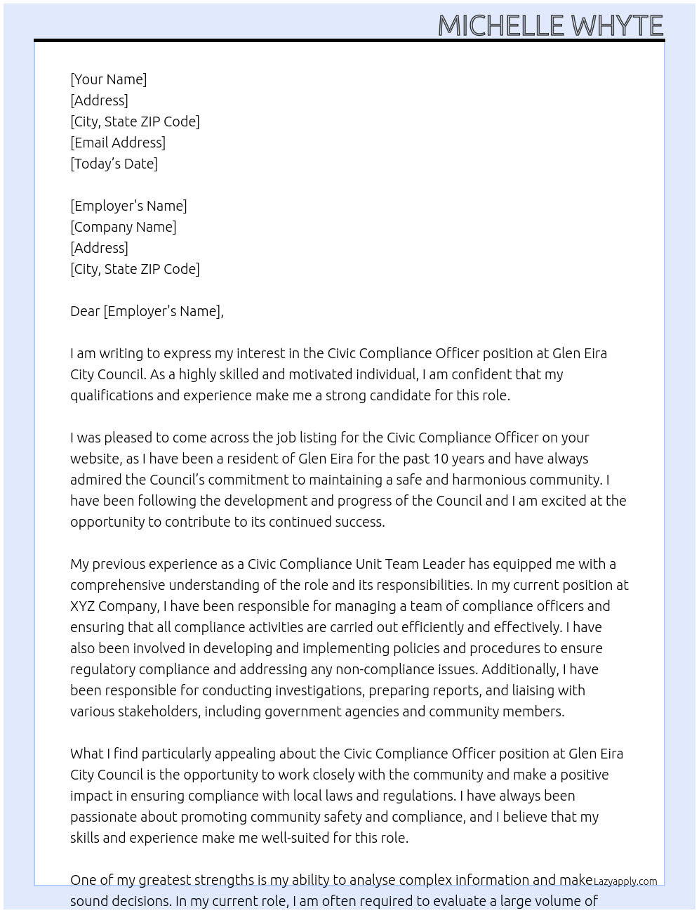 Civic Compliance Officer Cover Letter At Glen Eira City Council