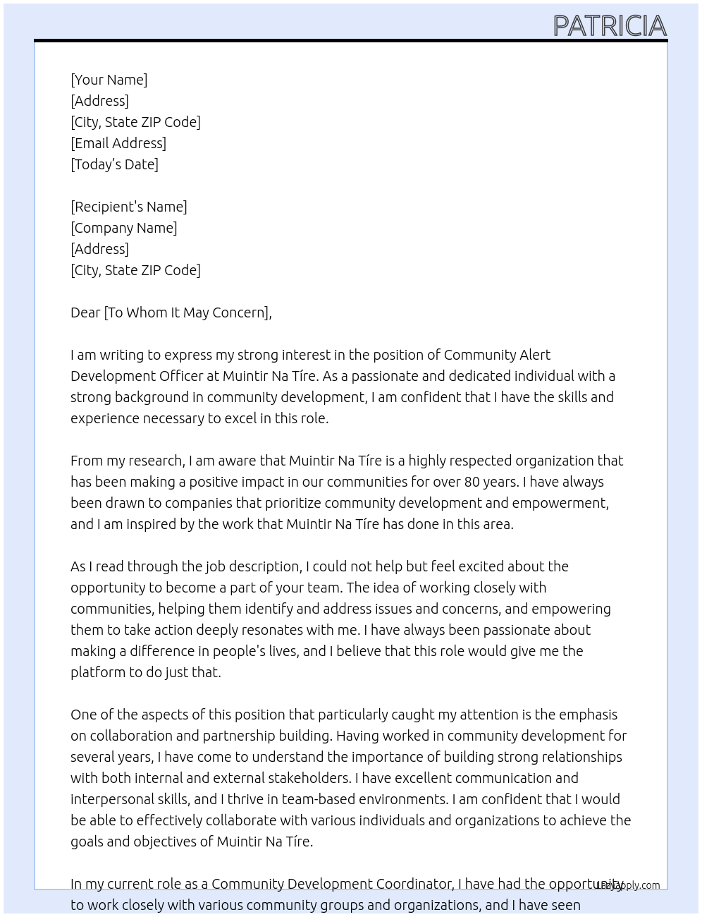 Check out these community alert development officer cover letter sample and examples previously used by job seekers to land on job interviews as community alert development officer. Use our AI cover letter generator to create a personalized cover letter as community alert development officer.