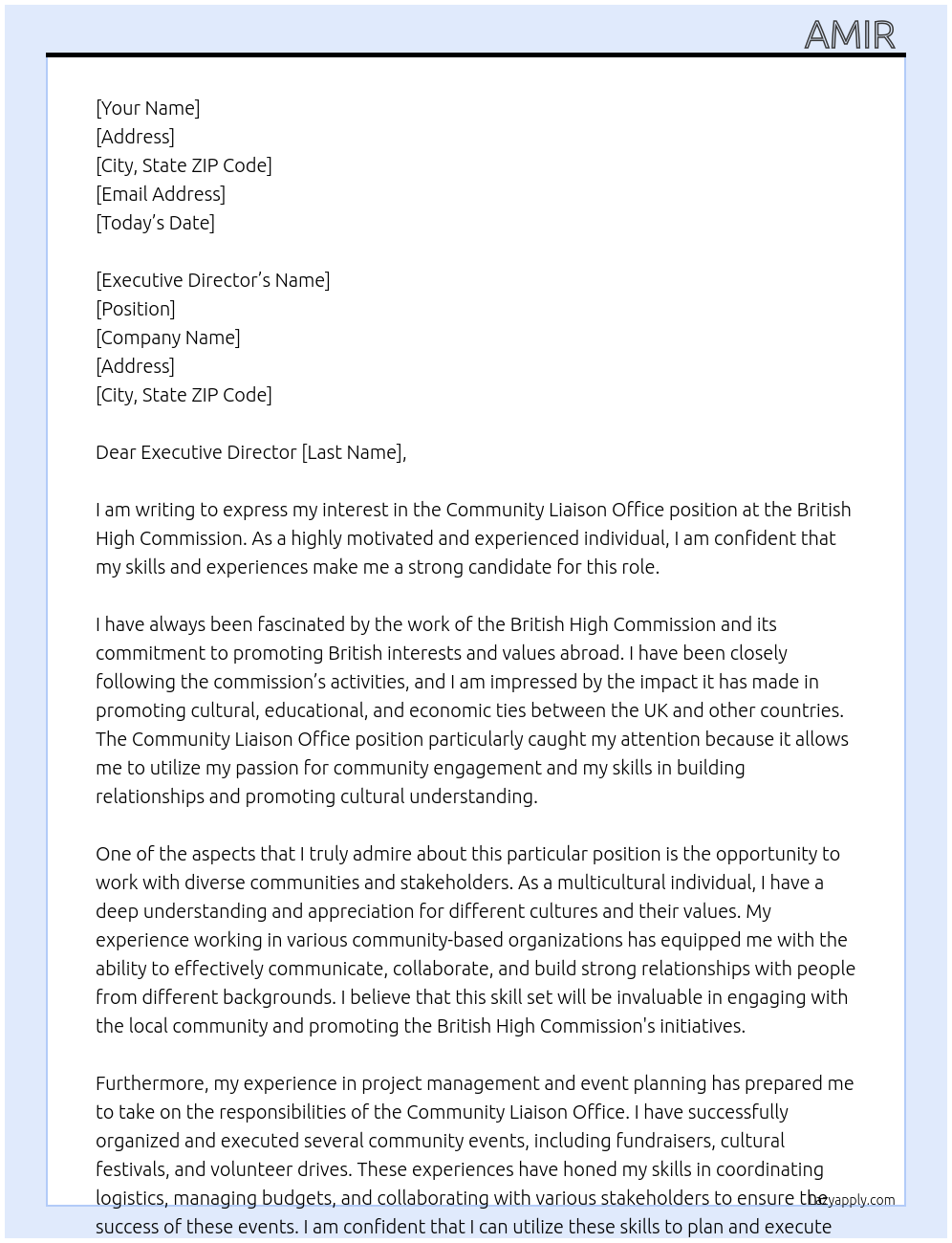 Check out these community liaison office cover letter sample and examples previously used by job seekers to land on job interviews as community liaison office. Use our AI cover letter generator to create a personalized cover letter as community liaison office.
