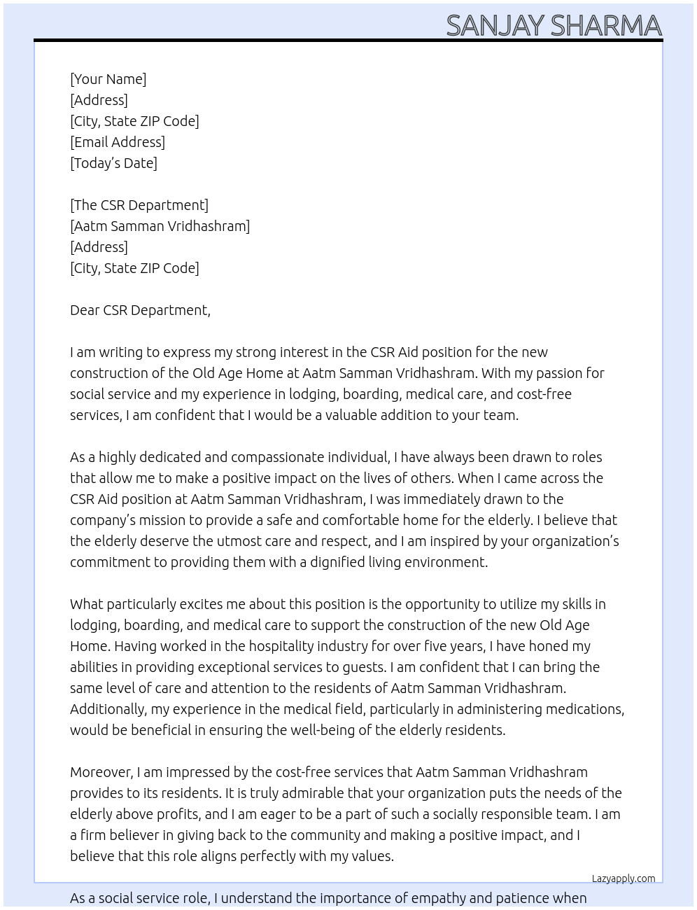 Cover letter for csr aid for new construction of old age home - LazyApply