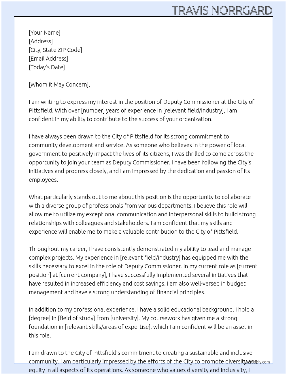 Deputy Commissioner Cover Letter At City of Pittsfield