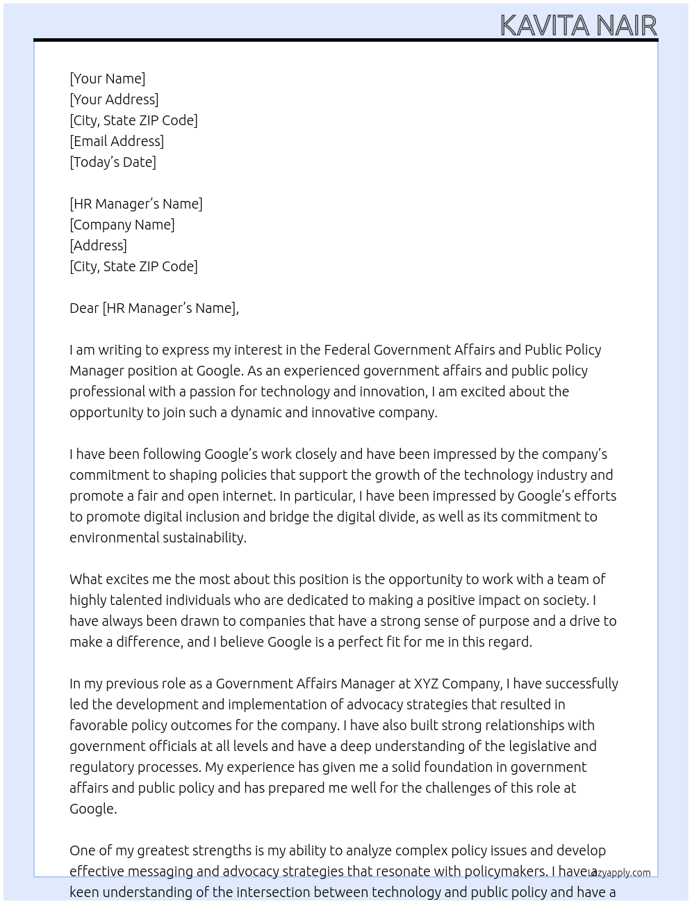 Federal Government Affairs and Public Policy Manager Cover Letter At Google