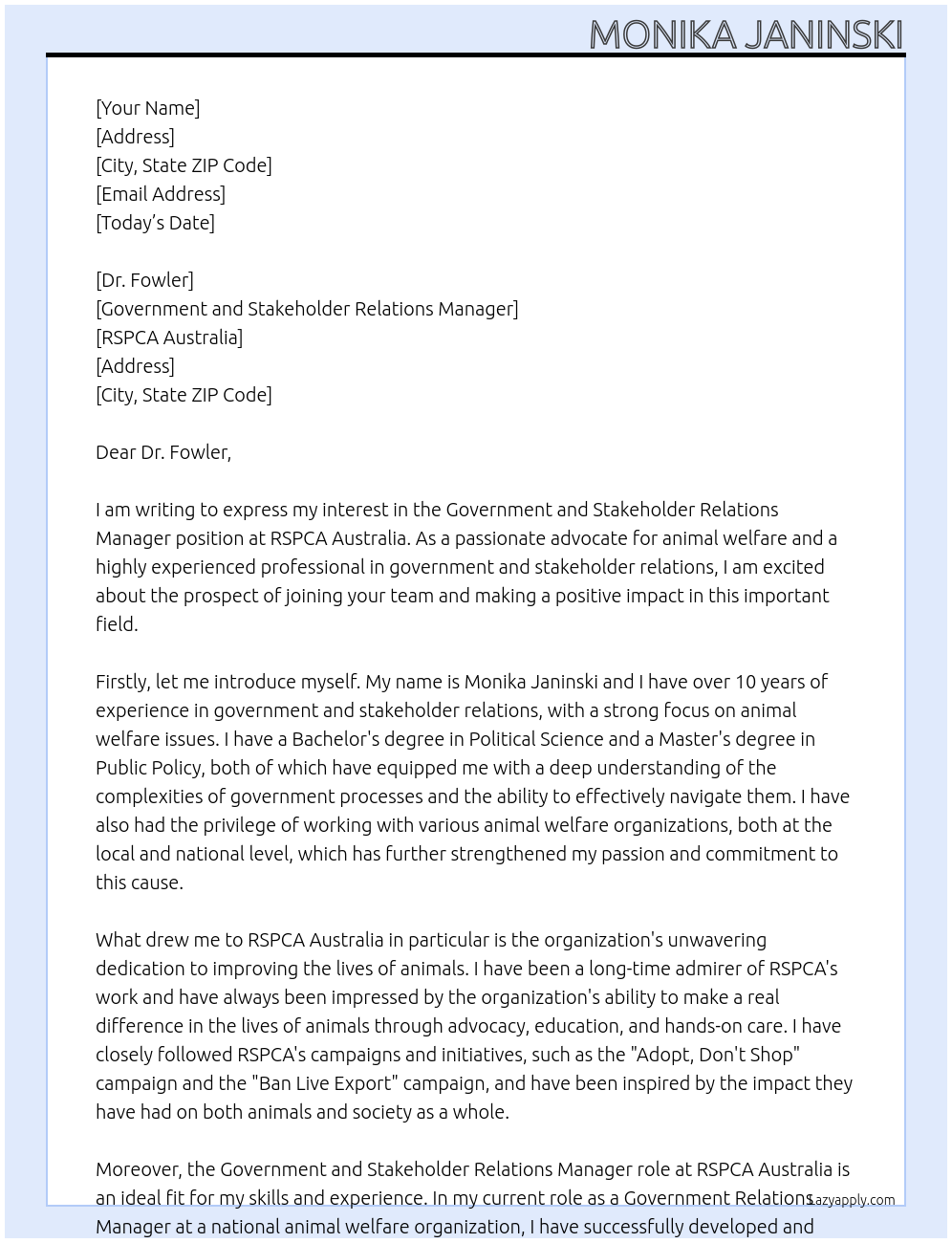 Cover letter for government and stakeholder relations manager - LazyApply