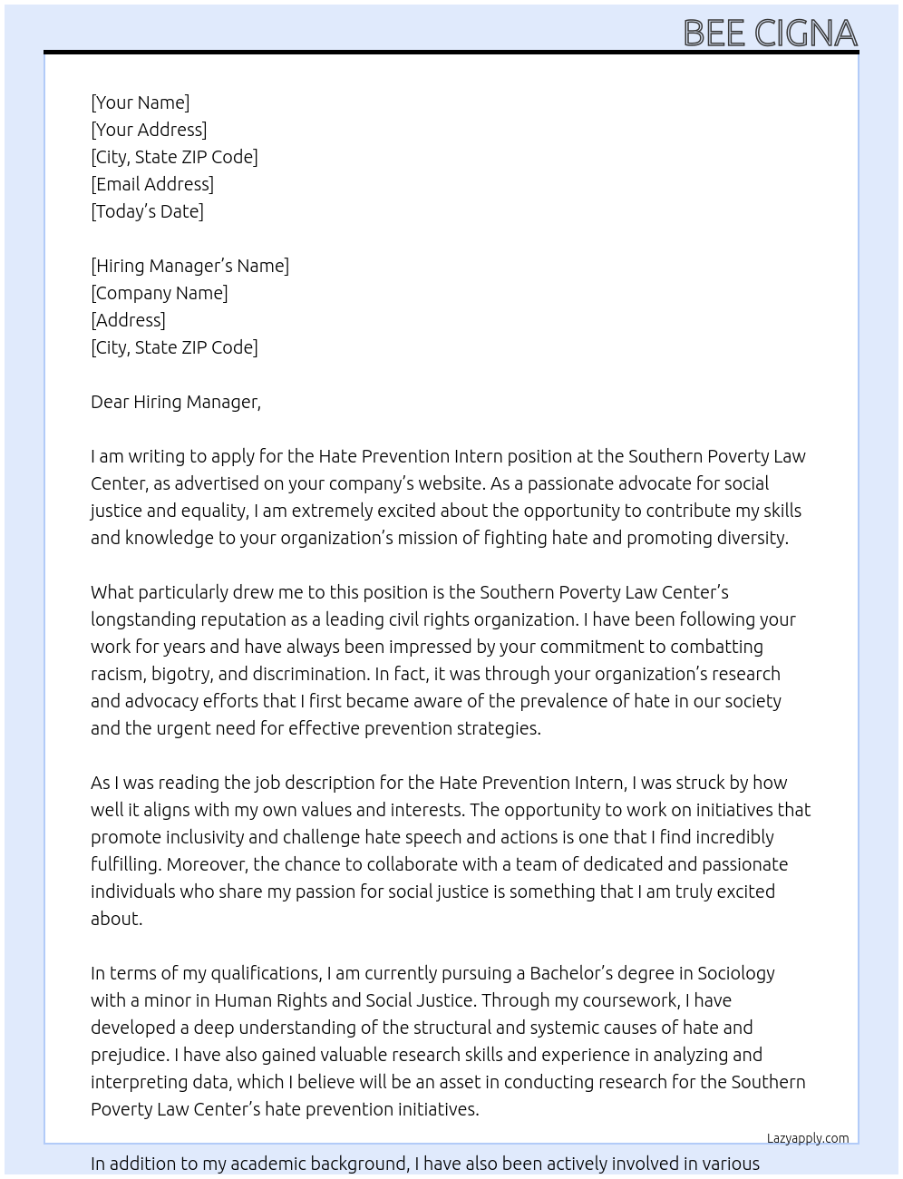 Hate Prevention Intern Cover Letter At Southern Poverty Law Center