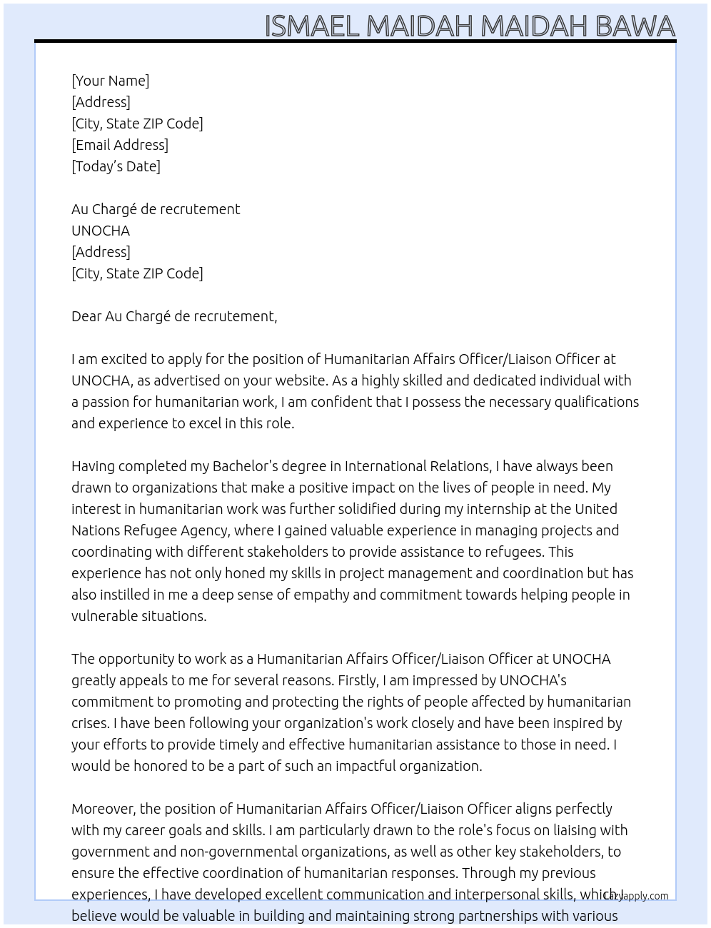 Humanitarian Affairs Officer/liaison Officer Cover Letter Examples
