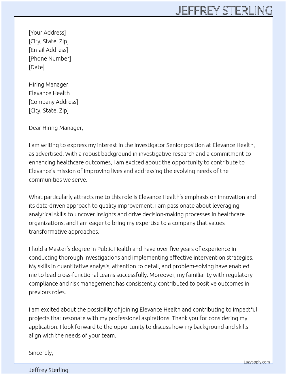 Check out these investigator senior cover letter sample and examples previously used by job seekers to land on job interviews as investigator senior. Use our AI cover letter generator to create a personalized cover letter as investigator senior.
