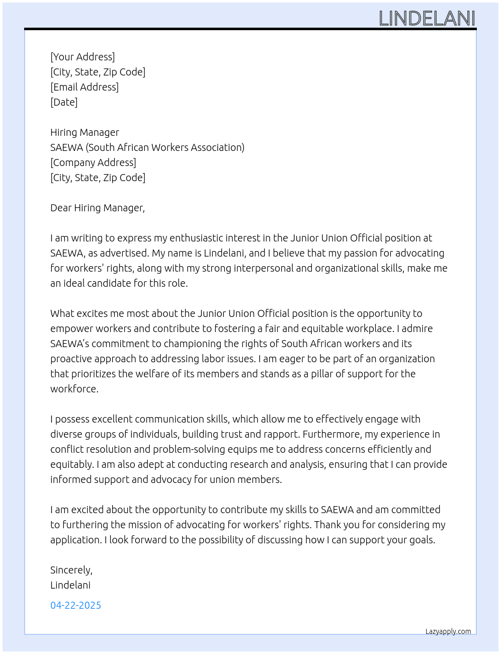 Junior Union Official Cover Letter At SAEWA (South African Workers Association)