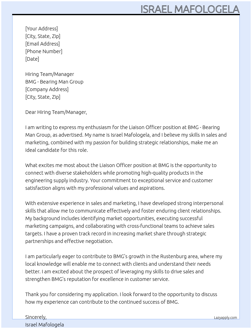 Liaison Officer Cover Letter At BMG - Bearing Man Group