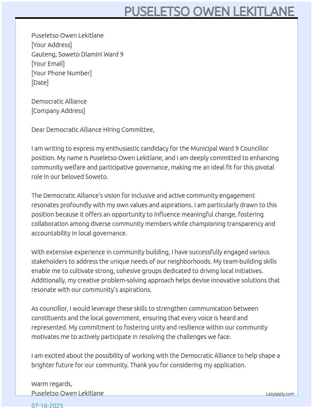Municipal ward 9 councillor cardidate position Cover Letter At Democratic alliance