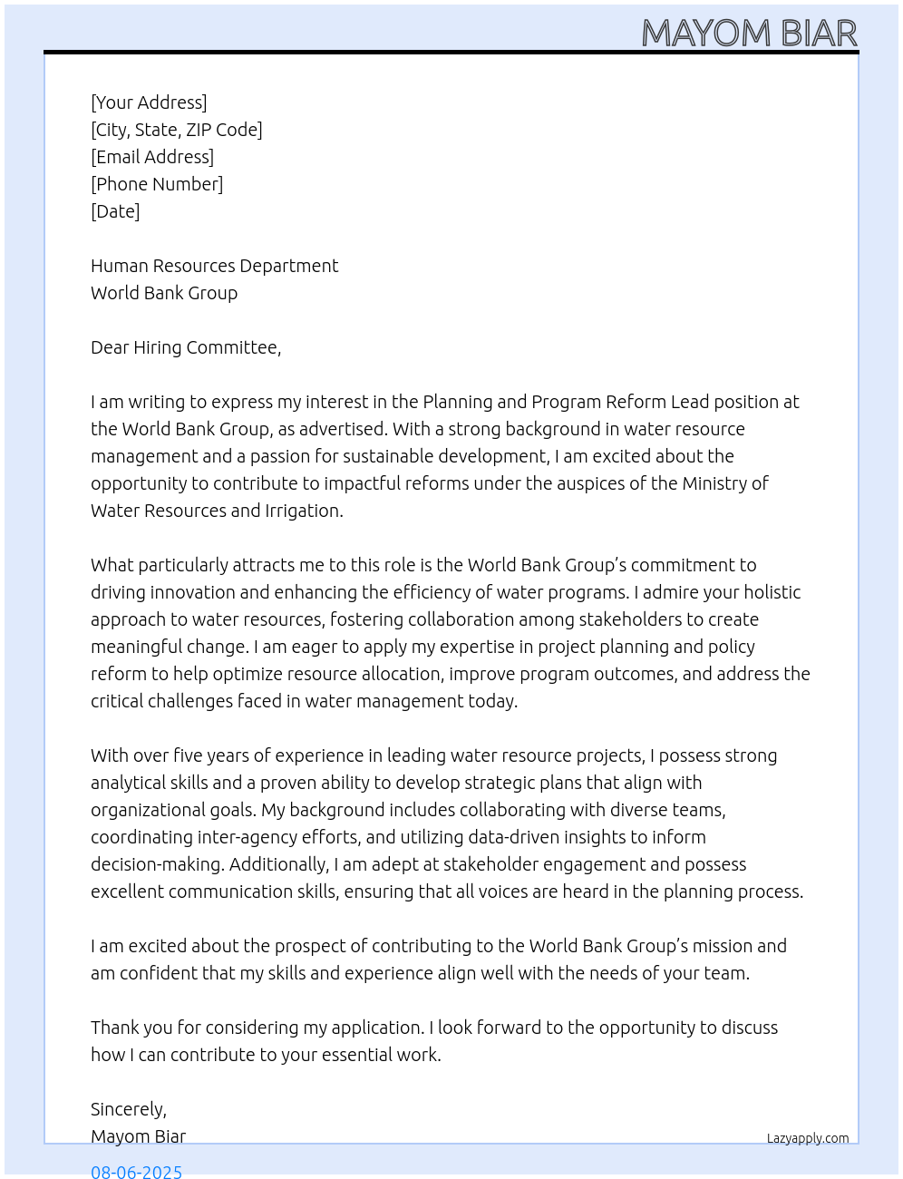 Planning and Program Reform Lead At Ministry of Water Resouces and Irrigation Cover Letter
