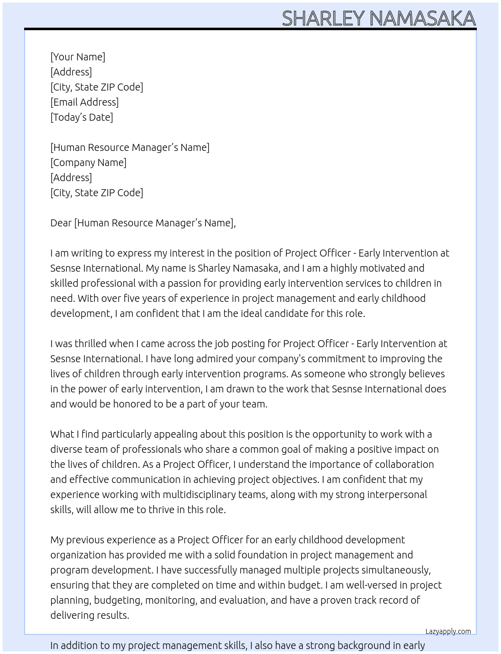 Check out these project officer -early intervention cover letter sample and examples previously used by job seekers to land on job interviews as project officer -early intervention. Use our AI cover letter generator to create a personalized cover letter as project officer -early intervention.
