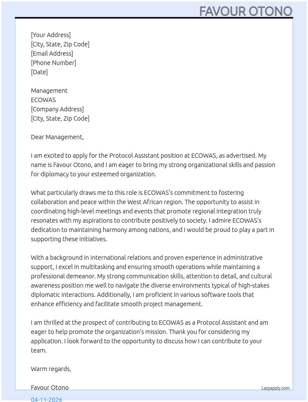 Check out these protocol assistant cover letter sample and examples previously used by job seekers to land on job interviews as protocol assistant. Use our AI cover letter generator to create a personalized cover letter as protocol assistant.