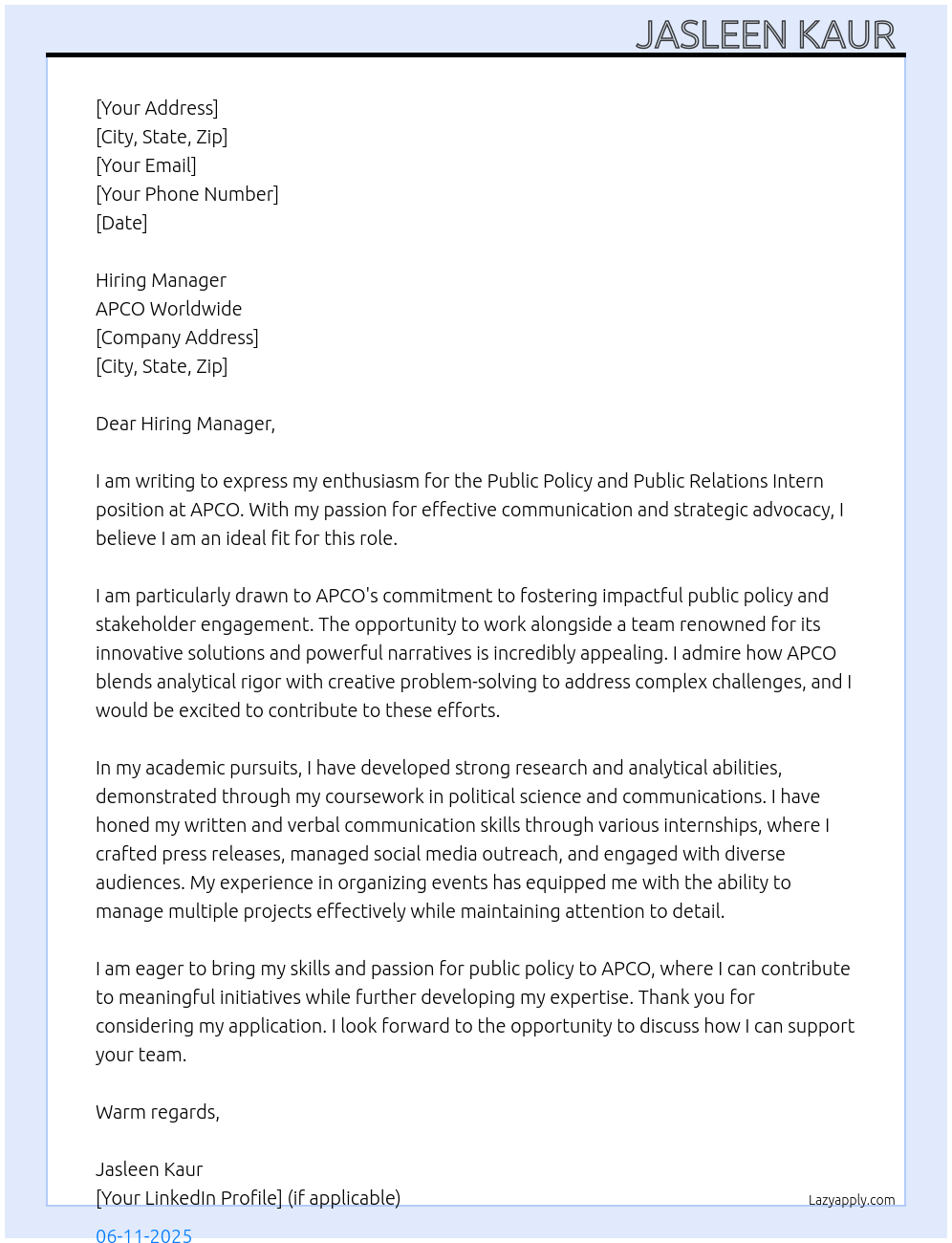 Check out these public policy and public relation intern cover letter sample and examples previously used by job seekers to land on job interviews as public policy and public relation intern. Use our AI cover letter generator to create a personalized cover letter as public policy and public relation intern.