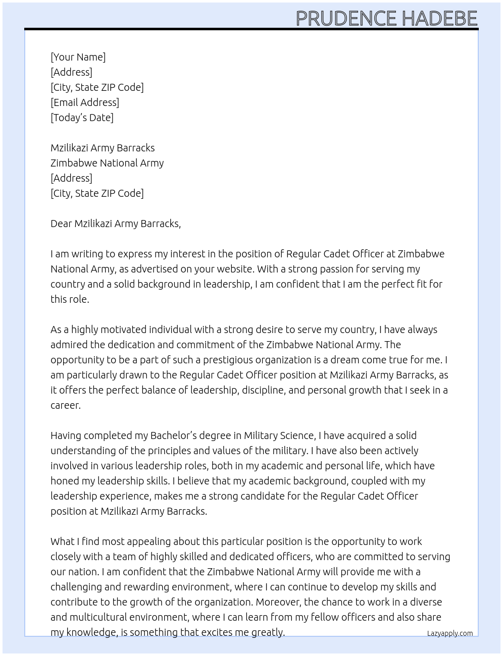 REGULAR CADET OFFICER Cover Letter At Zimbabwe National army