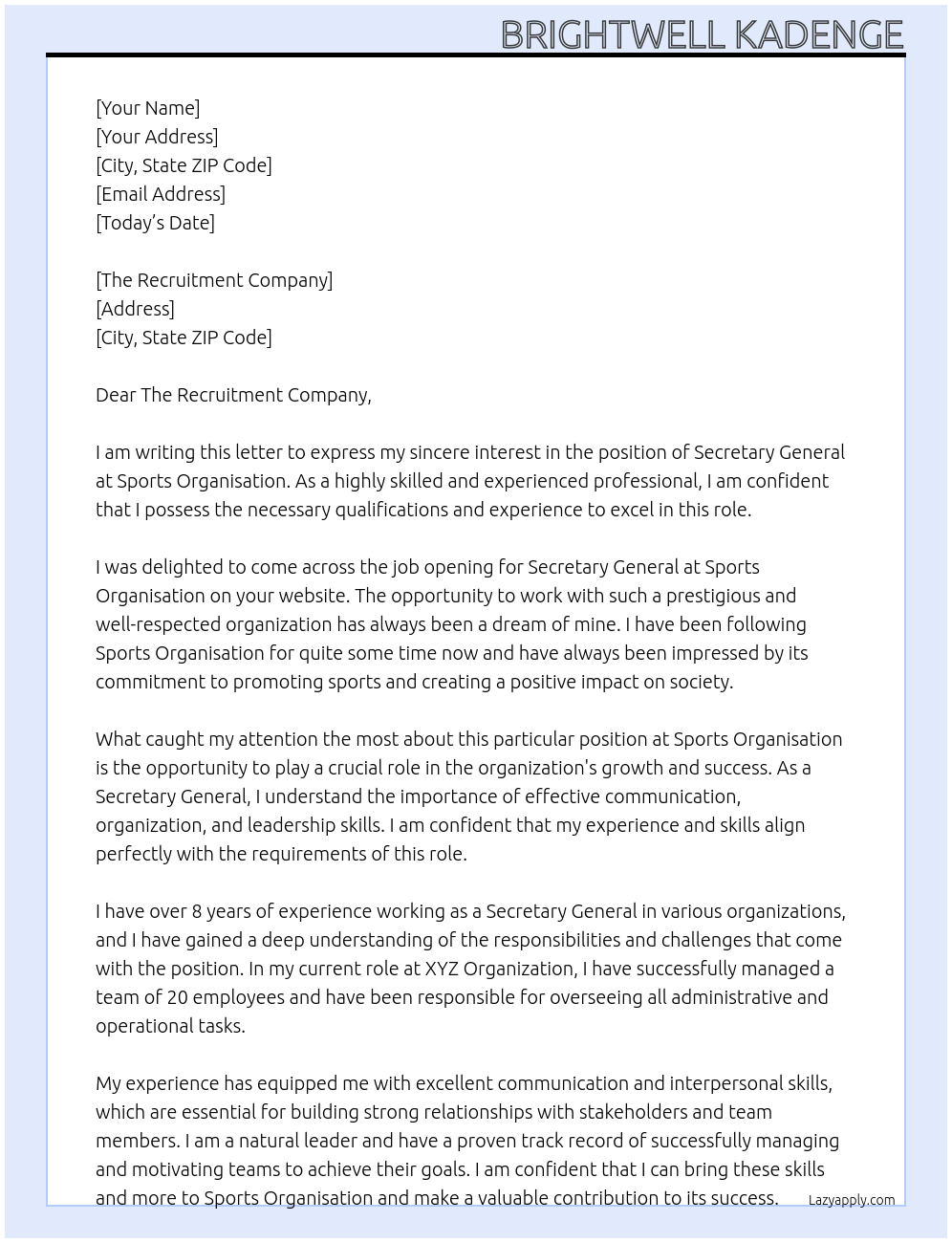 Check out these secretary general cover letter sample and examples previously used by job seekers to land on job interviews as secretary general. Use our AI cover letter generator to create a personalized cover letter as secretary general.