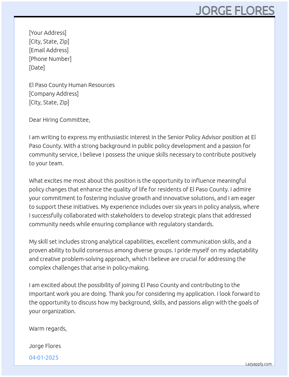 Check out these senior policy advisor cover letter sample and examples previously used by job seekers to land on job interviews as senior policy advisor. Use our AI cover letter generator to create a personalized cover letter as senior policy advisor.