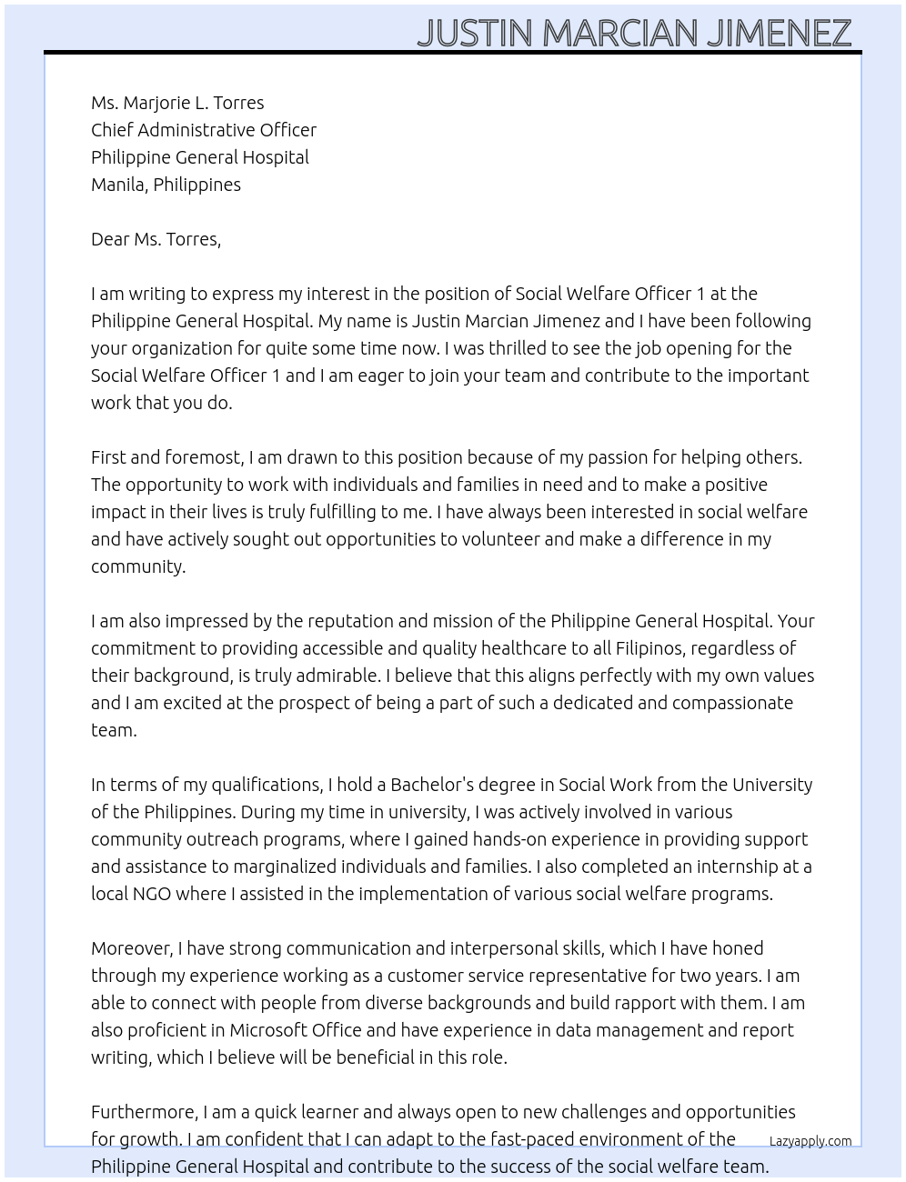 Social Welfare Officer 1 Cover Letter At Philippine General Hospital