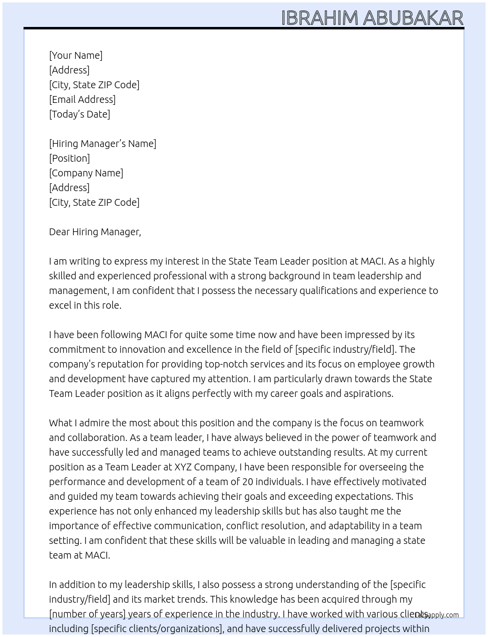 Check out these state team leader cover letter sample and examples previously used by job seekers to land on job interviews as state team leader. Use our AI cover letter generator to create a personalized cover letter as state team leader.