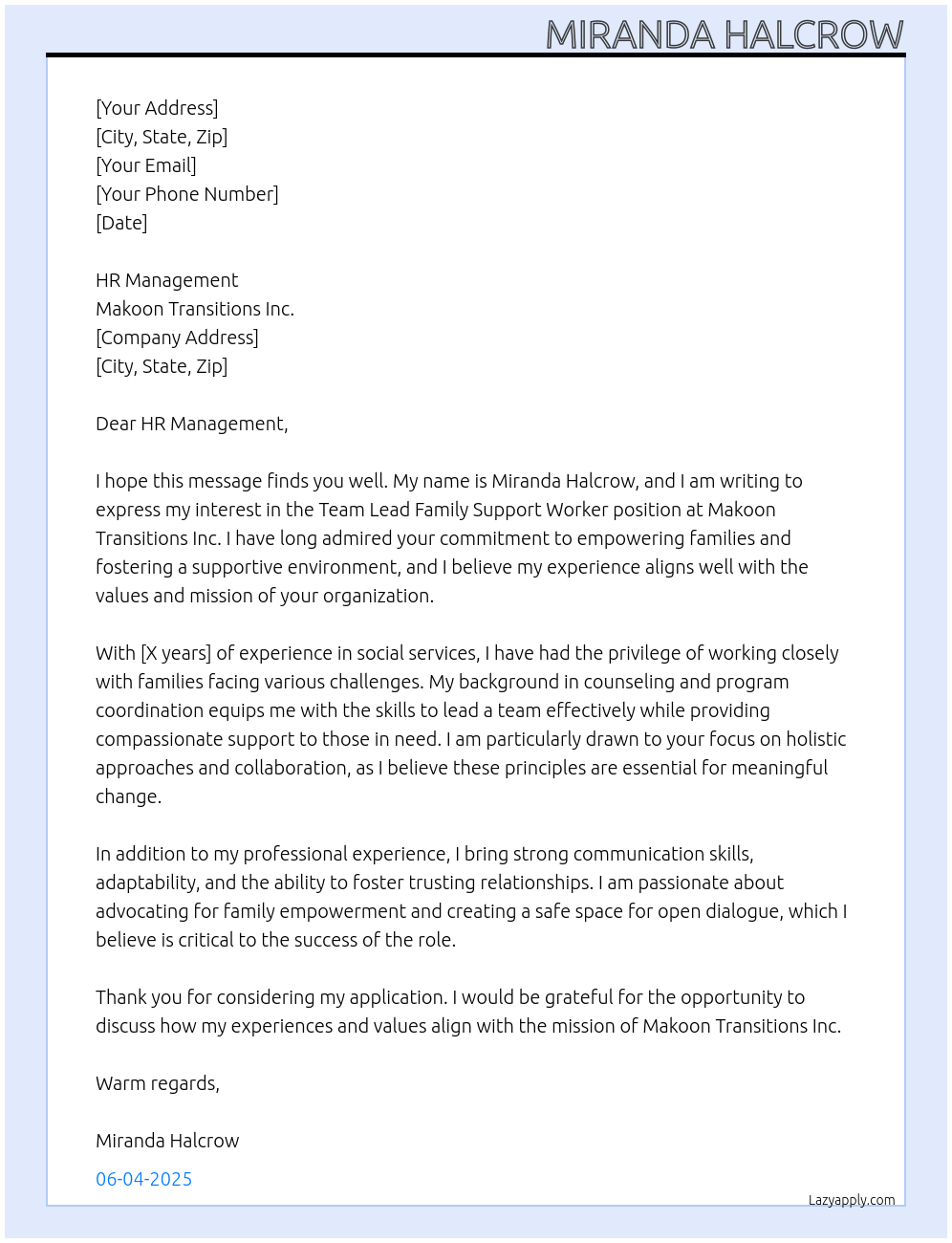 Team Lead family support worker Cover Letter At Makoon transitions inc