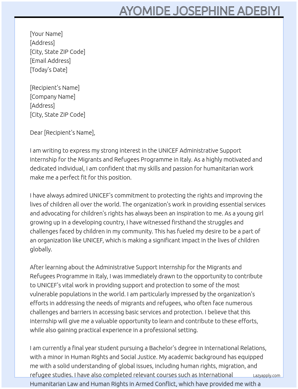 Unicef Administrative Support Internship Migrants And Refugees Programme Italy Cover Letter Examples And Template