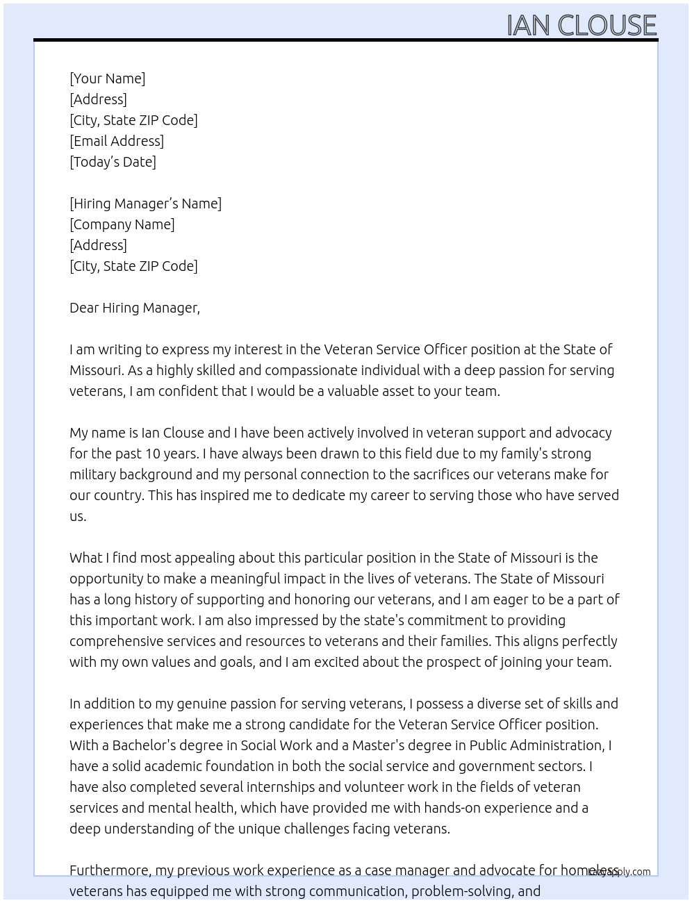 Check out these veteran service officer cover letter sample and examples previously used by job seekers to land on job interviews as veteran service officer. Use our AI cover letter generator to create a personalized cover letter as veteran service officer.